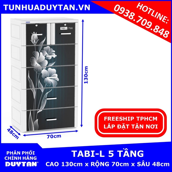 - Tủ nhựa Duy Tân Tabi-L 5 tầng có kích thước rộng 70cm x sâu 48cm x cao 130cm