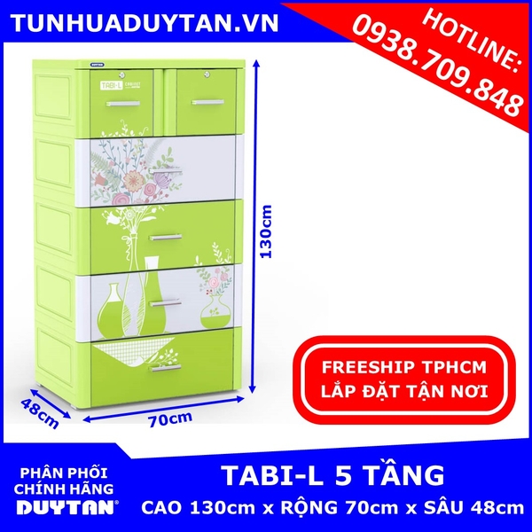 - Tủ nhựa Duy Tân Tabi-L 5 tầng có kích thước rộng 70cm x sâu 48cm x cao 130cm